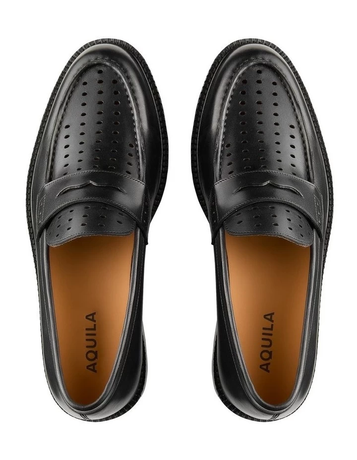 Give a nod to the season’s statement loafer trend with a pair like the Fredrick Black Leather loafers. This classic penny loafer with subtle perforated detail sits on a sturdy leather sole, making it a great loafer option for any season.